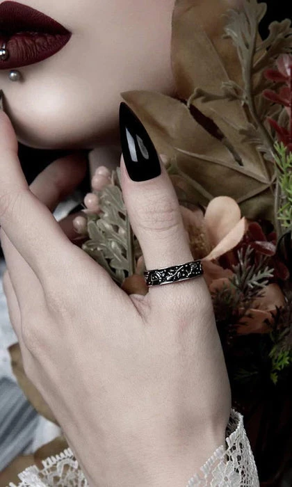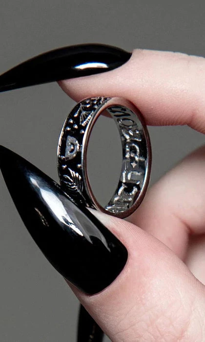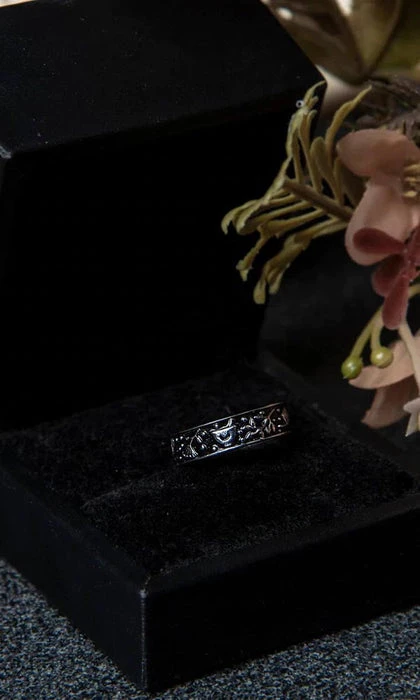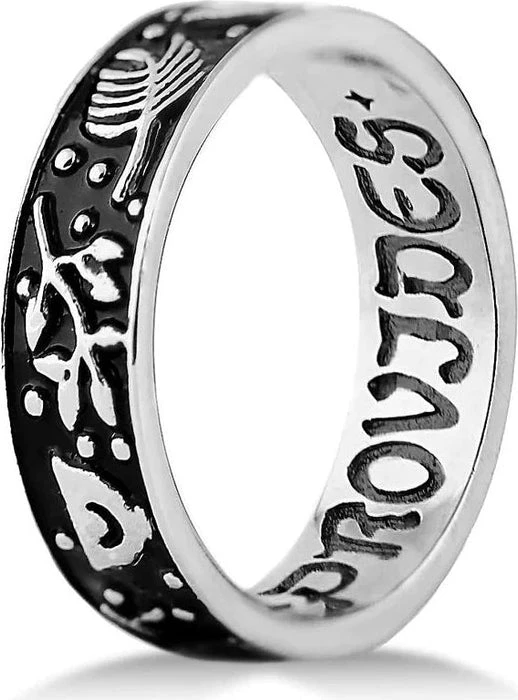 A Stainless Steel band 3D-sculpted with a repeating pattern of plants and a mortar & pestle and hand-dyed black, with “The Earth Provides” inscribed on the inside. May you graciously accept the gifts of Nature offered to you for a full and healthy life.