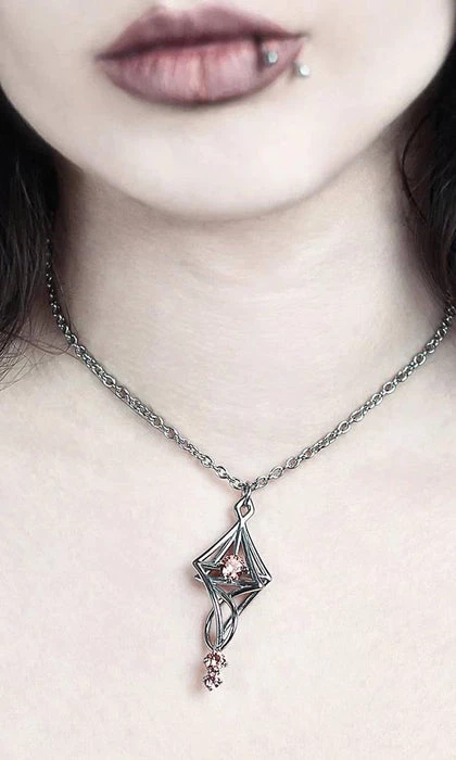 A beautiful Stainless Steel pendant with a Mirror Polish finish, adorned with three sparkling Rhodolite-colour gemstones, hanging on a Silver-plated chain.