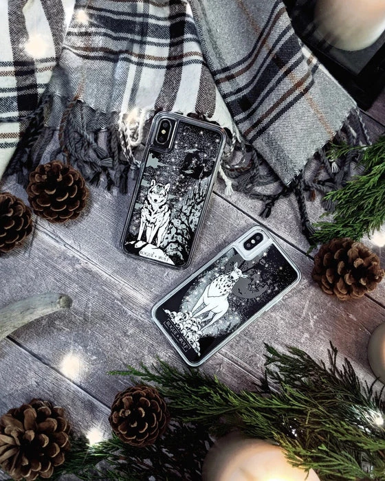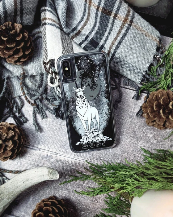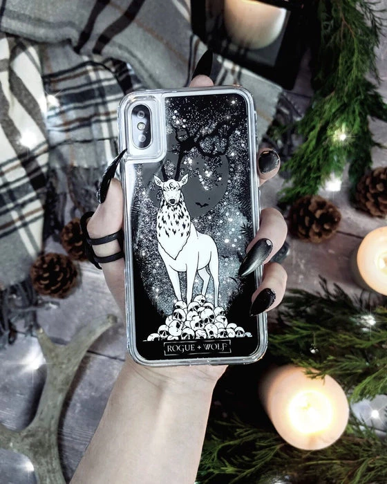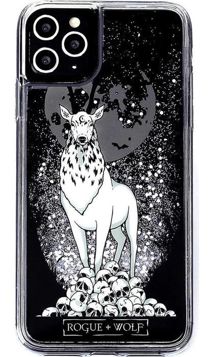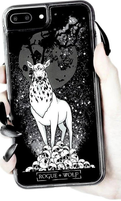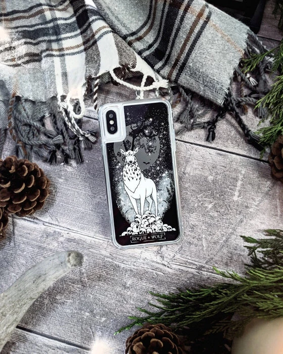 An Enchanting Phone Case featuring a gentle Stag Guardian atop a mound of skulls & bones of the fallen that dared to trespass, with a magical Silver Liquid Glitter background to represent the translucent impermanence of our mortality.