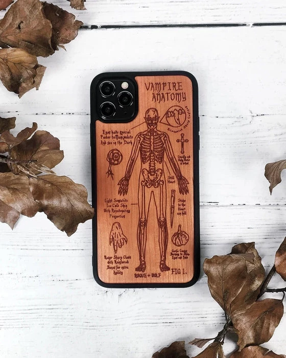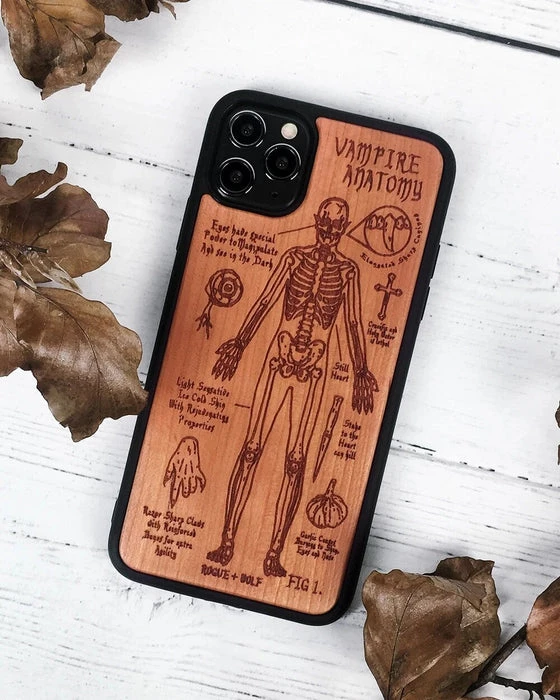 A Vampire’s Anatomy Wooden Phone Case engraved with an anatomical diagram of a creature of the night. Study it and study it well, it may just save your life!