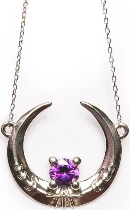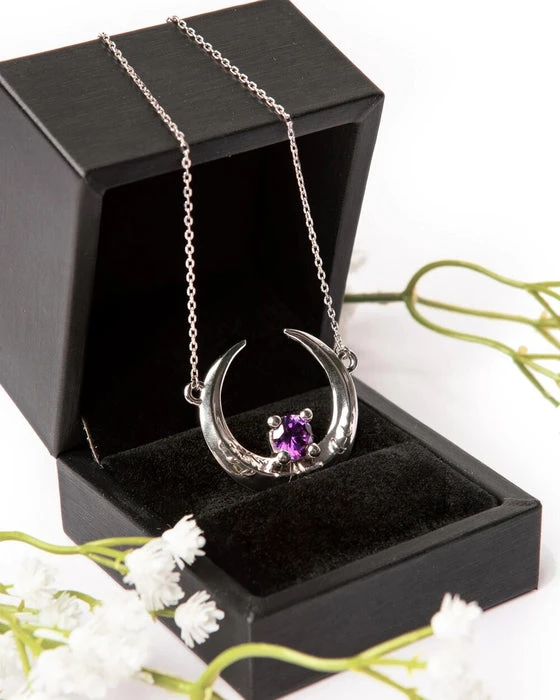 A stunning Sterling Silver Moon Necklace with the Sun and Moon hiding from each other, adorned with an Amethyst Cubic Zirconia. Mirror Polished Silver and extra magical!