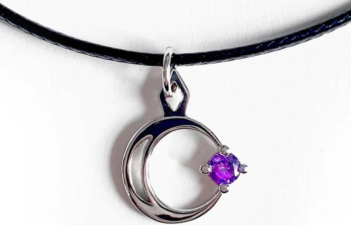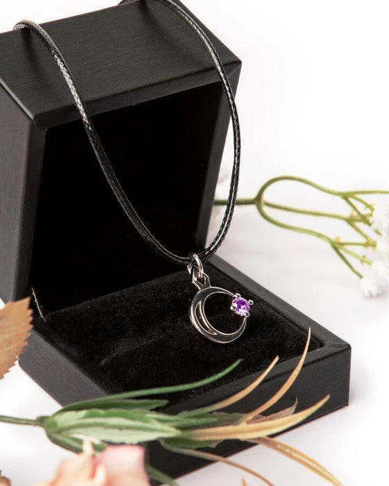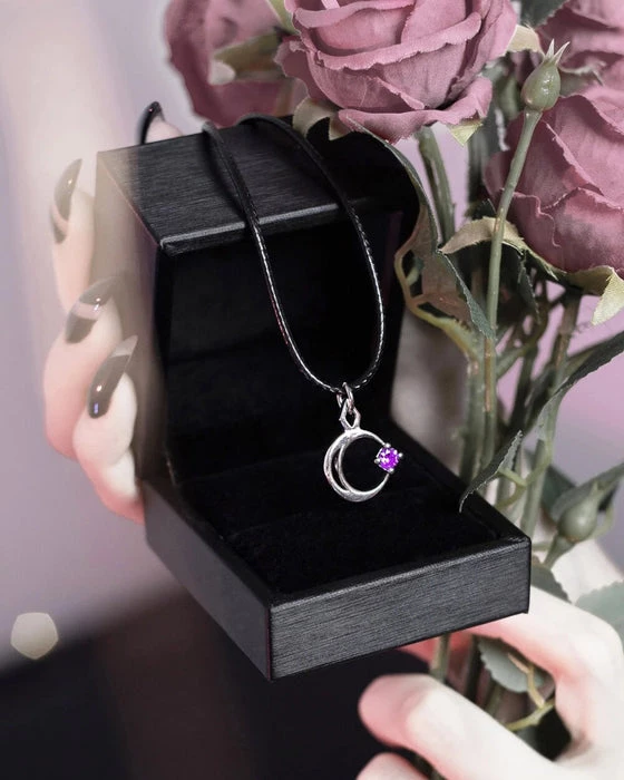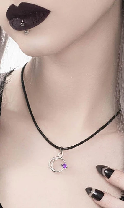A Silver Mirror Polished Necklace with the crescent Moon gently caressing a single star. Adorned with a Violet Cubic Zirconia gemstone.