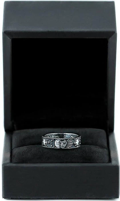 A Stainless Steel band 3D sculpted with suns and moons pushing aside clouds, hand-dyed black. “My Sun & Moon” inscribed within, to show someone how much they mean to you.