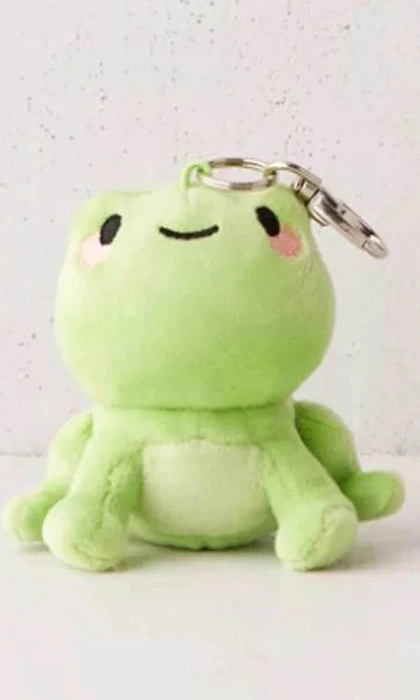 Hop around town with this little buddy in tow. Ultra-cute frog-shaped plushie featuring a clip keychain for attaching to your bag, keys or wallet.
