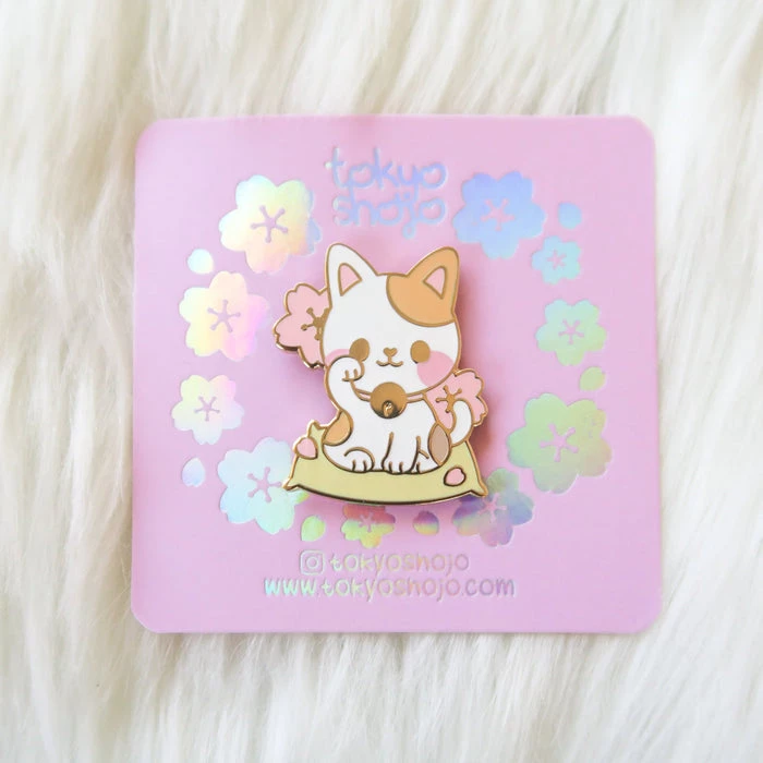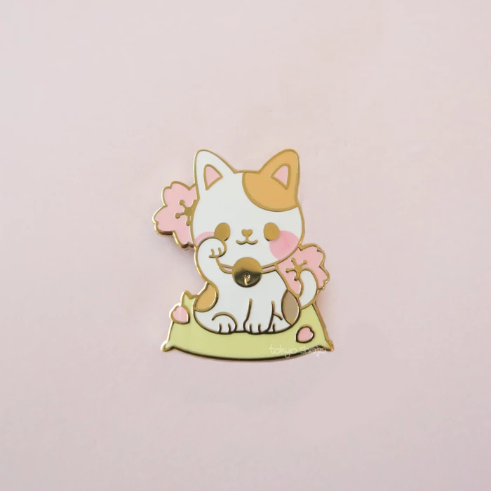 A lucky calico cat, beckoning prosperity with its raised right paw. Features a golden bell and sakura in the background.