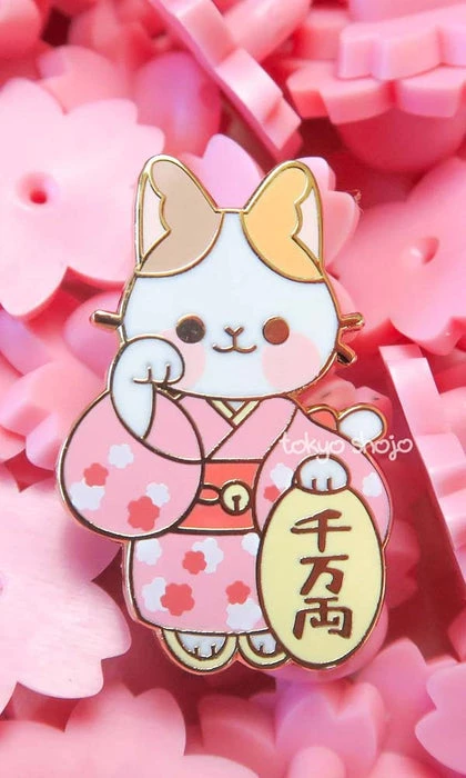 A lucky calico cat, beckoning prosperity with it’s raised right paw and holding a koban coin. Pink is said to bring luck in love!
