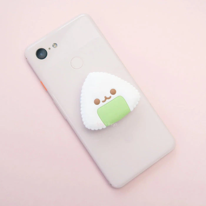 A cute phone grip of a smiling onigiri. You feel more compelled to befriend him than to eat him.