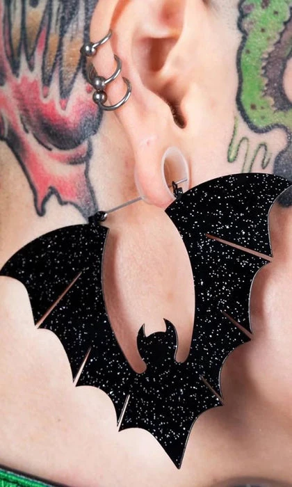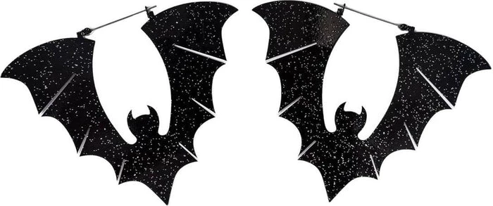 Shine as bright as the night in these Black Glitter Bat Earrings. These goth earrings are Plug friendly and cute.